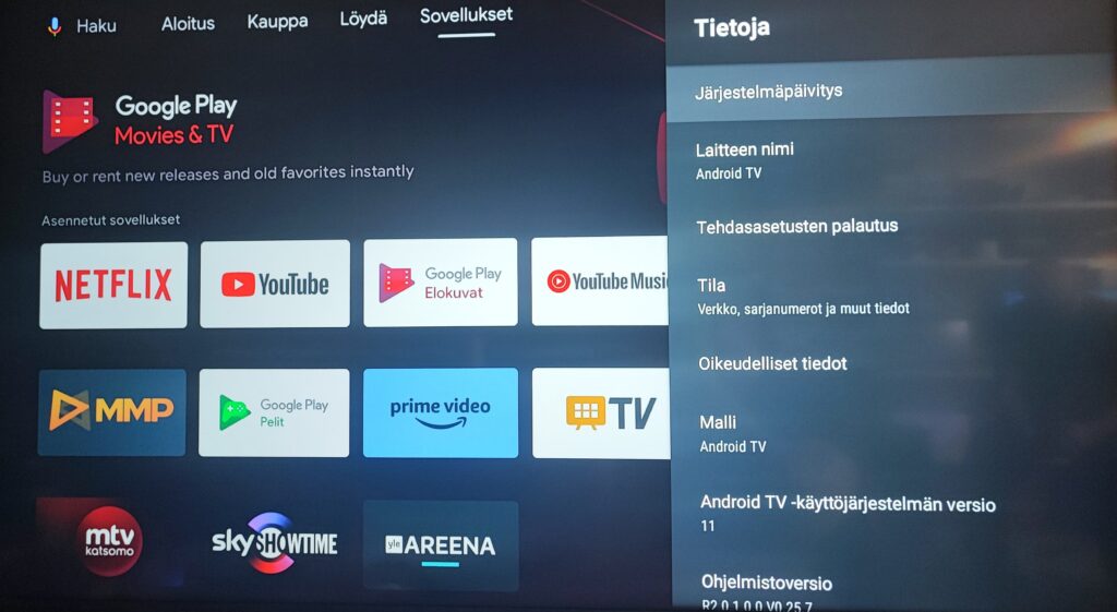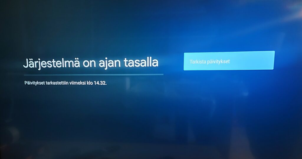 Television käyttöjärjestelmän päivittäminen on tärkeä toimenpiden laitteen toimivuuden kannalta. Jos televisio ei toimi halutulla on suositeltavaa tarkastaa onko laitteeseen saatavilla järjestelmäpäivitystä. Järjestelmäpäivitysten saatavuus on hyvä tarkistaa myös tasaisin väliajoin mikäli automaattipäivitykset eivät laitteessa ole kytkettynä päälle. Laitteen ilmoittaessa järjestelmäpäivitysten saatavuudesta on suotavaa suorittaa päivitys viipyilemättä. Alla ohjeet järjestelmäpäivityksen tarkistamiseen.