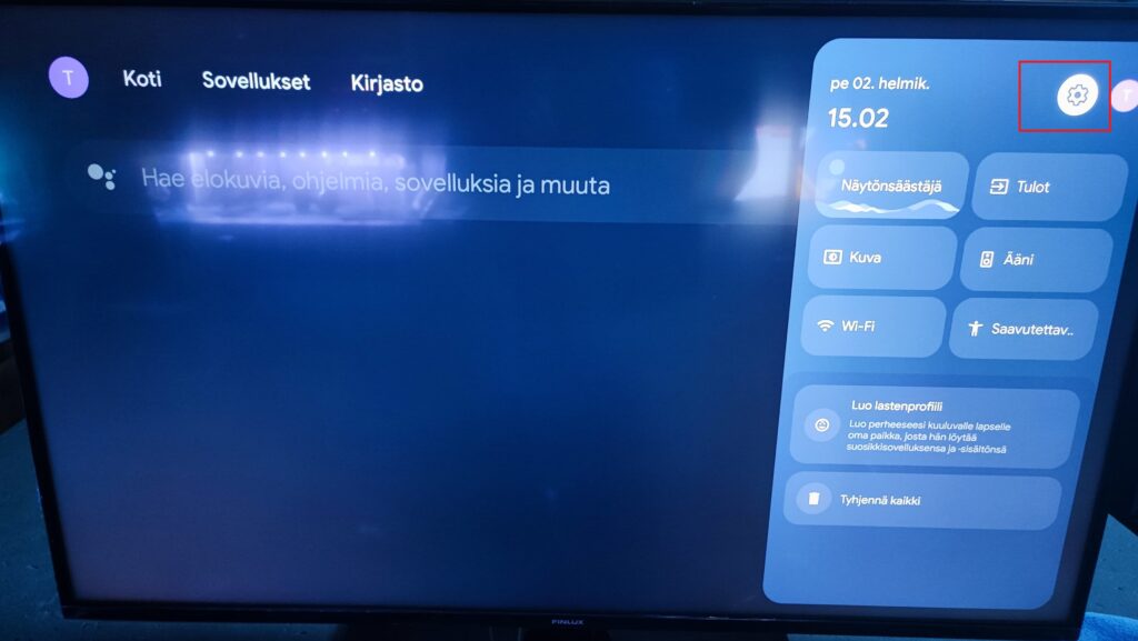 Google TV:n päävalikossa aloitetaan navigoimalla kaukosäätimen nuolinäppäimillä oikean yläkulman ”Ratas”-kuvakkeeseen. Kohdistimen ollessa ”Ratas”-kuvakkeen päällä, painetaan kaukosäätimen ”OK”-painiketta.