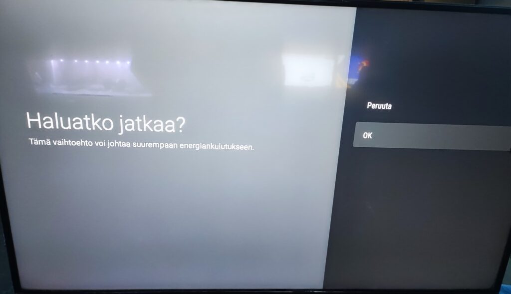 Kytkettyäsi automaattisen taustavalon pois päältä, järjestelmä vielä varmistaa sinulta tahdotko varmasti tehdä tämän valinnan. Suuremman energiankulutuksen ilmoituksesta ei tule huolestua. Tämä muutos ei ole merkittävä ja muutoksen voi huoletta hyväksyä, jotta voit jatkaa television sujuvaa käyttöä.