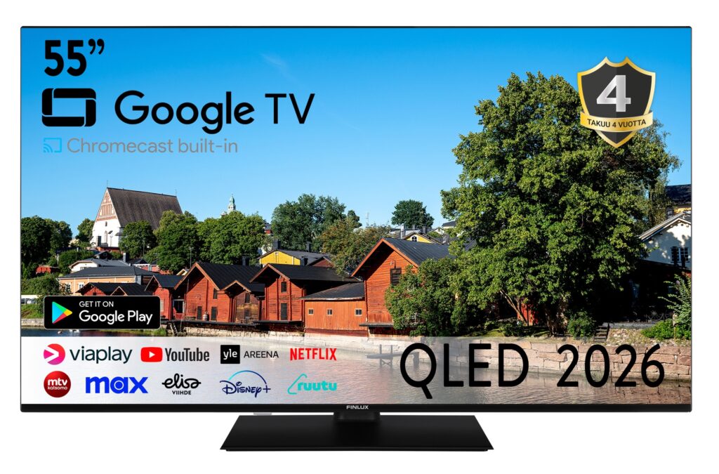 Google TV – Markkinoiden laajin sovellustarjontaFINLUX 55″ G9 GoogleTV, 55G9.3GCMB, on 4K UHD Android Smart LED-televisio keskijalustalla, 4-Vuoden takuu, Googlecast, WIFI+Bluetooth, CI+, 3xHDMI 2.1, 2xUSB,